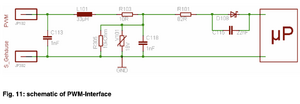 Fig. 11: Schematic of PWM-InterfaceCircuit diagram showing PWM input conditioning with resistors, capacitors, diode, and connection to microcontroller (µP).