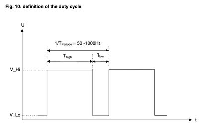 Fig. 10: Definition of the duty cycleTypical square wave PWM signal showing VHi, VLo, Thigh, Tlow, and period.